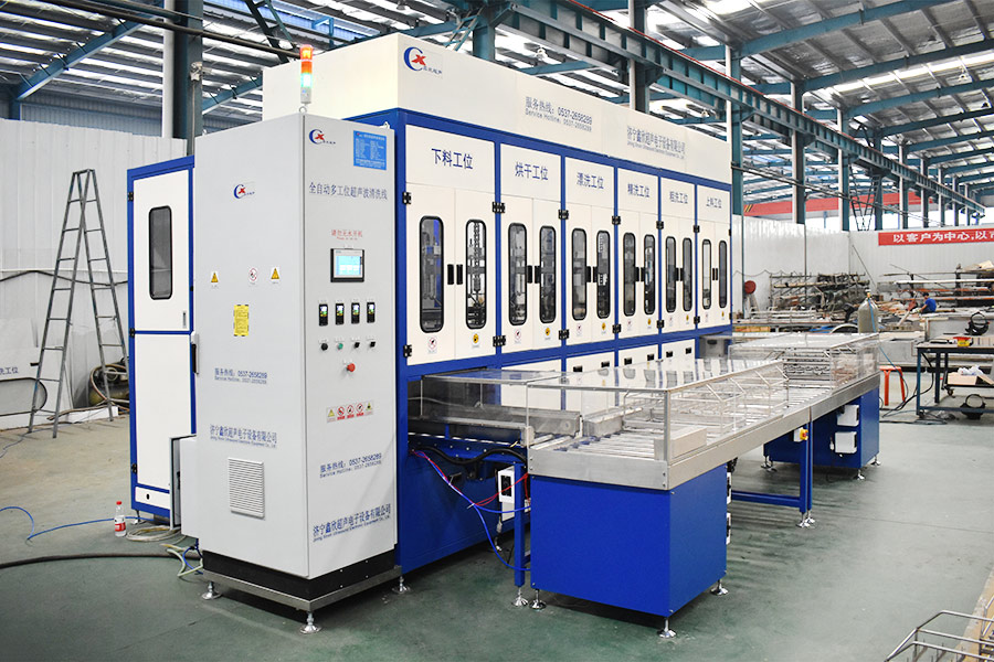 該設備有自動上下料及轉角系統、超聲波清洗系統,自動拋動、自動溢流和油污分離裝置,噴淋系統、自動高壓切水系統、自動烘干系統。機械手自動輸送系統采用高精度直線導軌配合高精度位置檢測傳感器,機械手可以準確的實現工件的抓取和放置。自動進排液和自動加溫系統完全實現了無人干預,自動運行,很大地程度上降低了工人的勞動強度。先進的霧氣處理系統可以將清洗時產生的霧氣冷凝回流,空氣經過濾和活性炭吸附后排出。