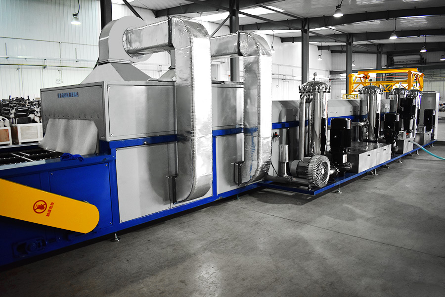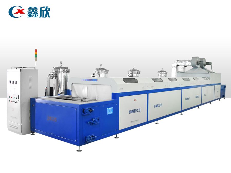 該設備有上下料網帶、超聲波清洗工位、噴淋漂洗工位、高壓風切、熱風烘干工位、溫控水加熱系統、風機、溫控空氣加熱系統、移動式風刀、PLC+觸摸屏控制系統、管路系統及智能電器控制系統等組成。自動進排液和自動加溫系統完全實現了無人干預,自動運行,很大程度上降低了工人的勞動強度。先進的霧氣處理系統可以將清洗時產生的霧氣冷凝回流,空氣經過濾和活性炭吸附后排出。
