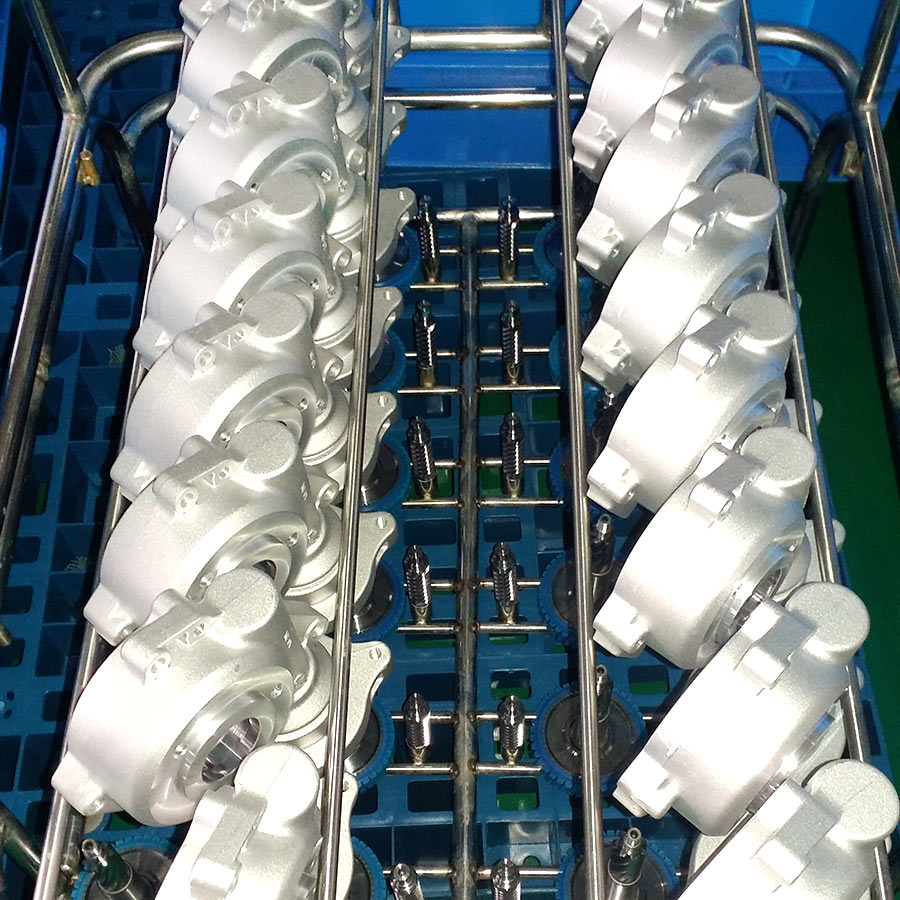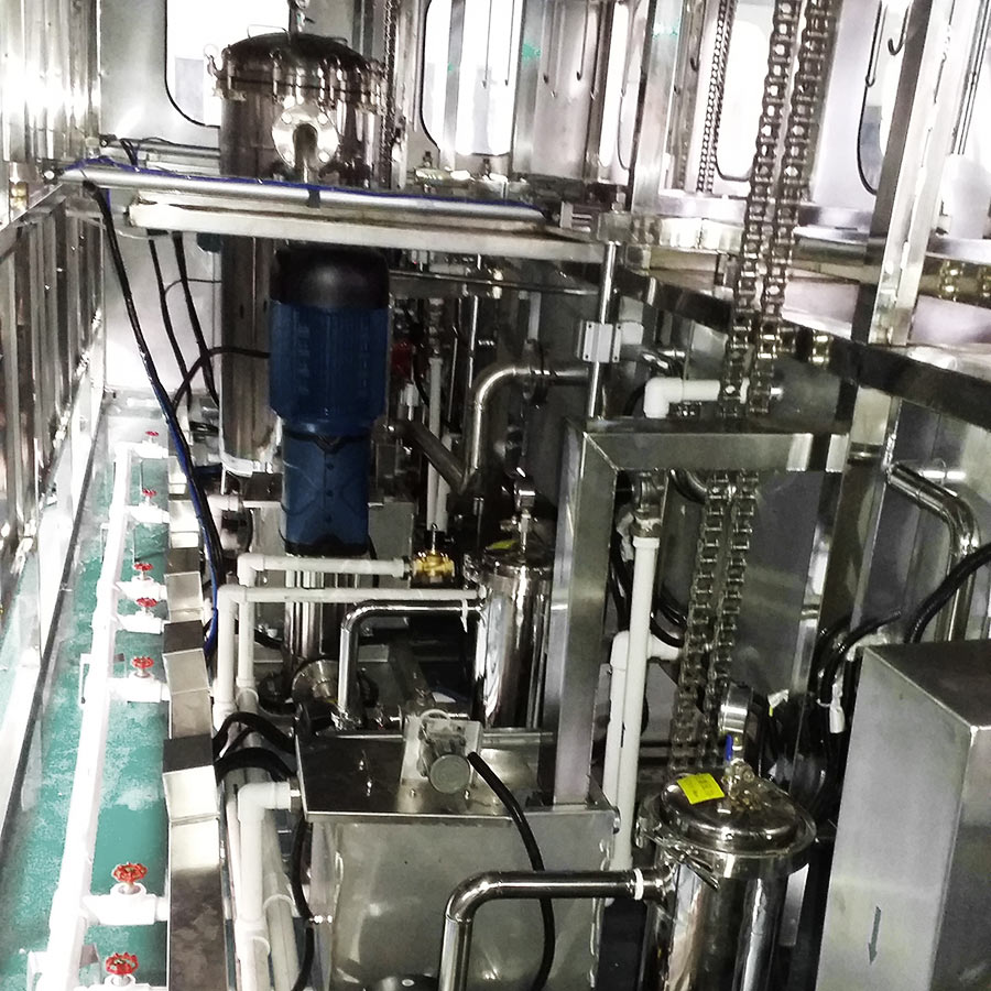 該設備有自動上下料及轉(zhuǎn)角系統(tǒng)、超聲波清洗系統(tǒng),自動拋動、自動溢流和油污分離裝置,噴淋系統(tǒng)、自動高壓切水系統(tǒng)、自動烘干系統(tǒng)。機械手自動輸送系統(tǒng)采用高精度直線導軌配合高精度位置檢測傳感器,機械手可以準確的實現(xiàn)工件的抓取和放置。自動進排液和自動加溫系統(tǒng)完全實現(xiàn)了無人干預,自動運行,很大程度上降低了工人的勞動強度。先進的霧氣處理系統(tǒng)可以將清洗時產(chǎn)生的霧氣冷凝回流,空氣經(jīng)過濾和活性炭吸附后排出。
