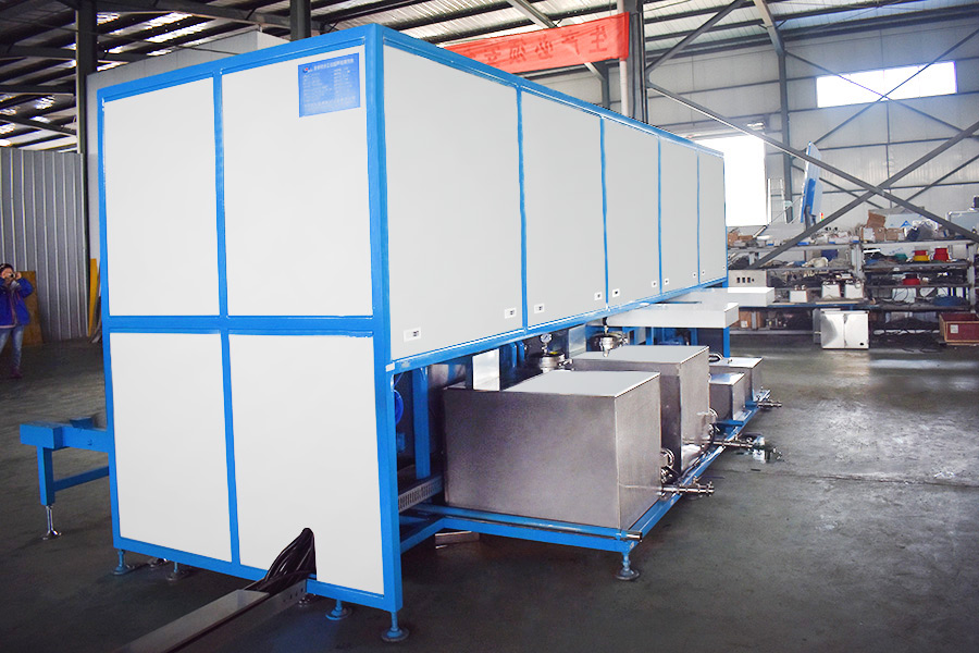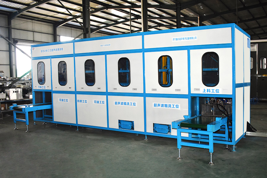 該設(shè)備有自動上下料及轉(zhuǎn)角系統(tǒng)、超聲波清洗系統(tǒng),自動拋動、自動溢流和油污分離裝置,噴淋系統(tǒng)、自動高壓切水系統(tǒng)、自動烘干系統(tǒng)。機械手自動輸送系統(tǒng)采用高精度直線導(dǎo)軌配合高精度位置檢測傳感器,機械手可以準確的實現(xiàn)工件的抓取和放置。自動進排液和自動加溫系統(tǒng)完全實現(xiàn)了無人干預(yù),自動運行,很大程度上降低了工人的勞動強度。先進的霧氣處理系統(tǒng)可以將清洗時產(chǎn)生的霧氣冷凝回流,空氣經(jīng)過濾和活性炭吸附后排出。